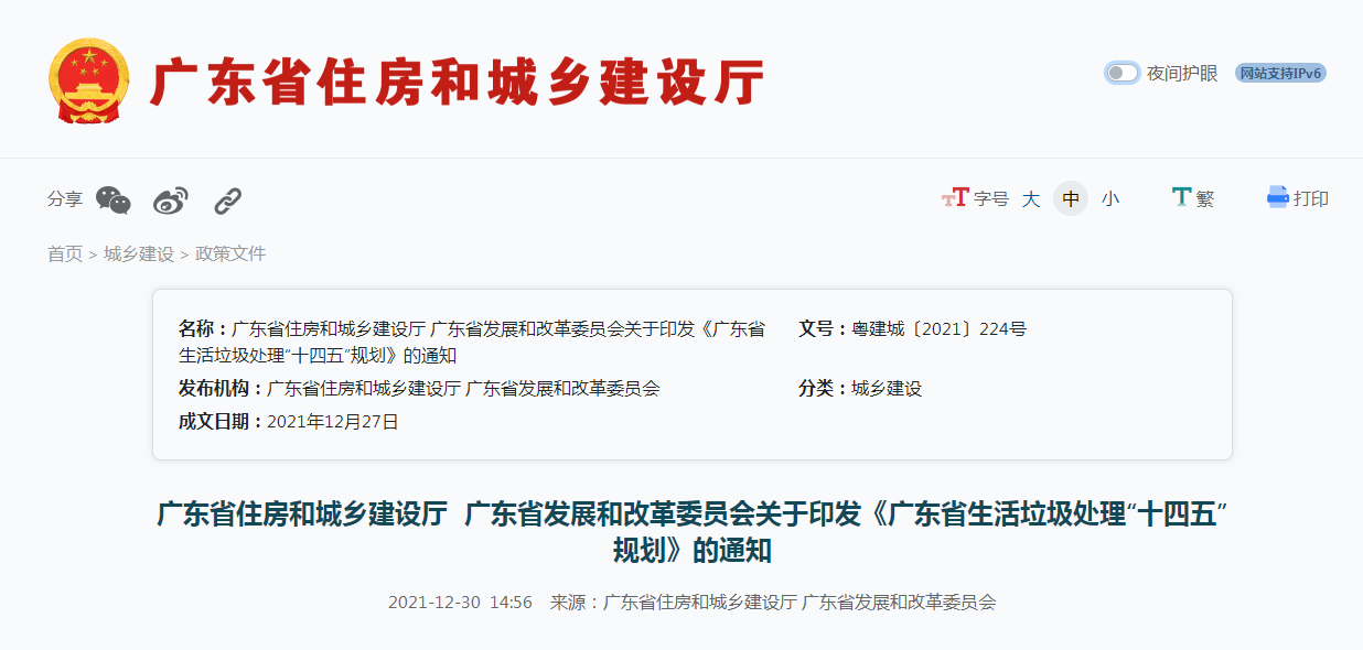 广东省生活垃圾处理“十四五”规划