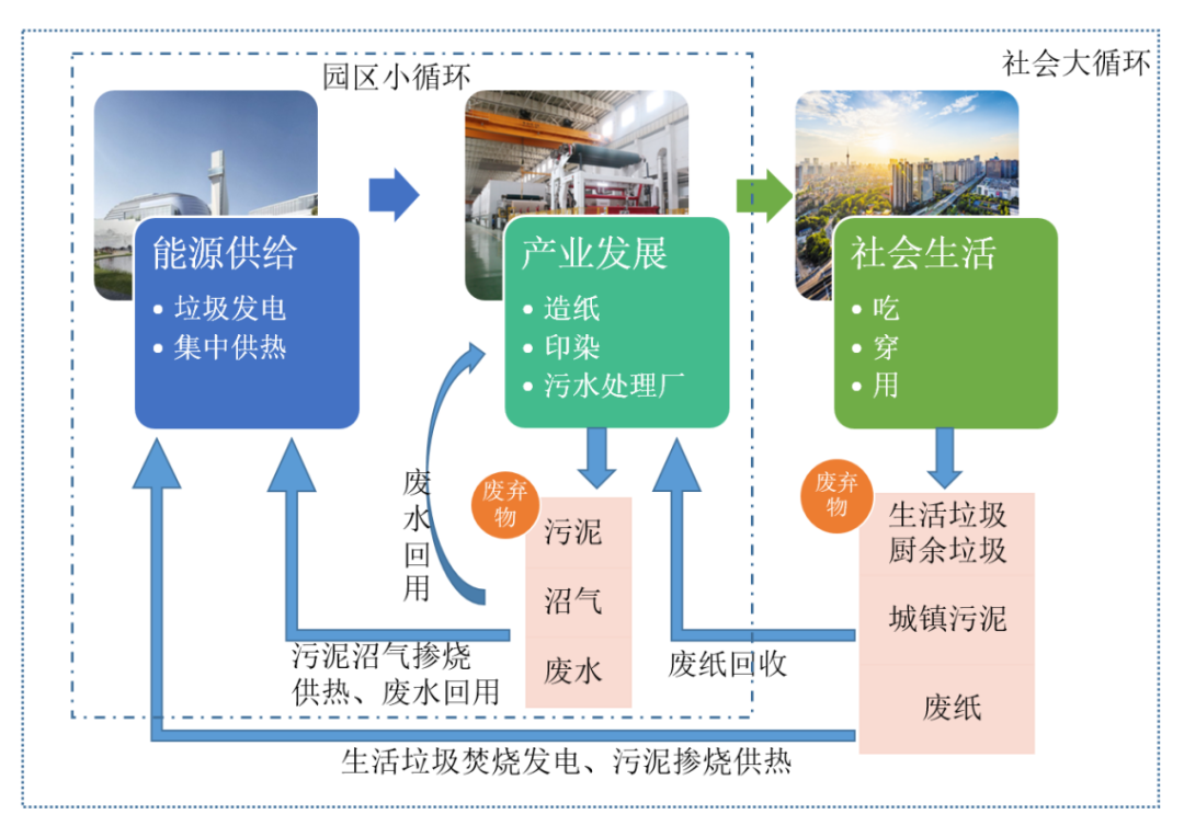 通过社会层面的垃圾、污泥等废弃物分类处理处置“外循环”,实现源头减量化,并将部分废弃物通过园区“内循环”作为原材料,进行垃圾发电、集中供暖和循环利用等,供应社会能源利用,实现内外循环闭环运转。