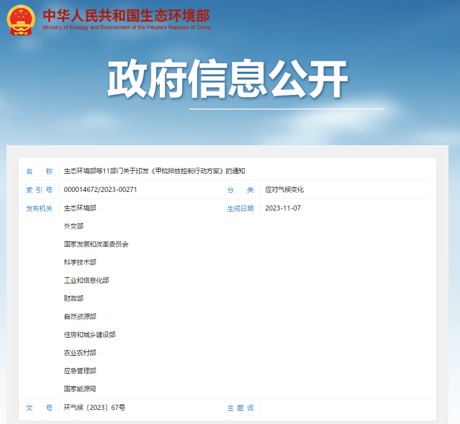 生态环境部等11部门关于印发《甲烷排放控制行动方案》的通知