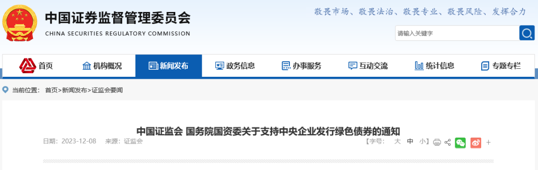 近日,中国证监会、国务院国资委发布《关于支持中央企业发行绿色债券的通知》。《通知》提出,支持中央企业发行绿色债券,发展节能降碳、环境保护、资源循环利用、清洁能源、生态保护修复和利用、基础设施绿色升级等产业。鼓励中央企业根据绿色项目预期投资回收周期,发行中长期债券。